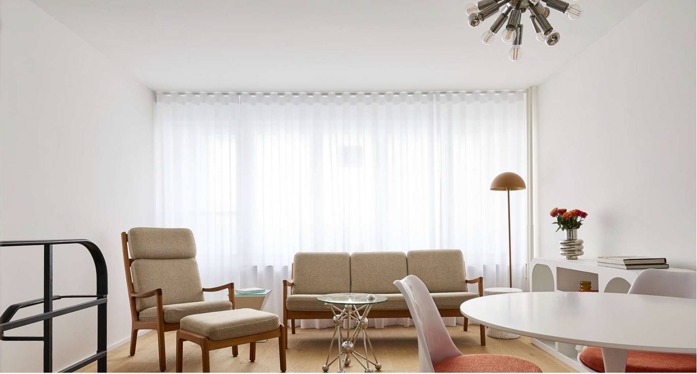Wesentliche charakteristische Merkmale wurden hierbei erhalten. Die Möblierung steht bewusst eklektisch im Dialog und referenziert die verschieden Dekaden der Lebenspanne des Hauses seit den 1950er Jahren.